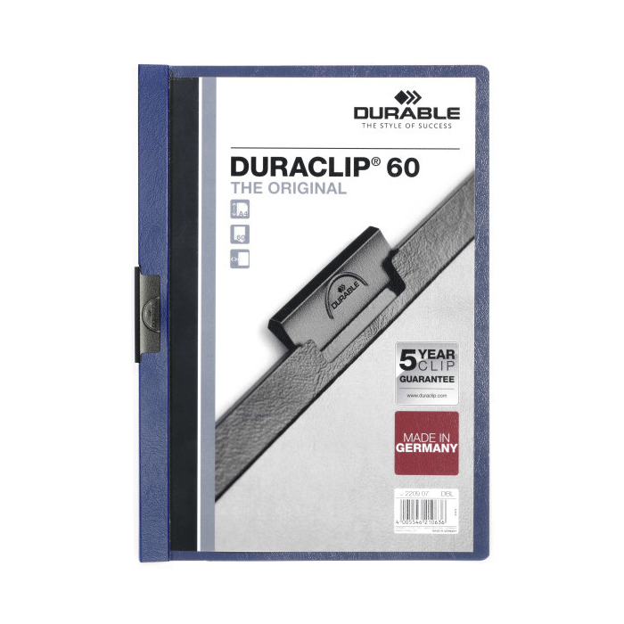 Chemise de présentation A4 couleur Bleu foncé avec clip pour le maintien de documents commerciaux et administratifs DURABLE Duraclip Original 60. Référence 2209-07