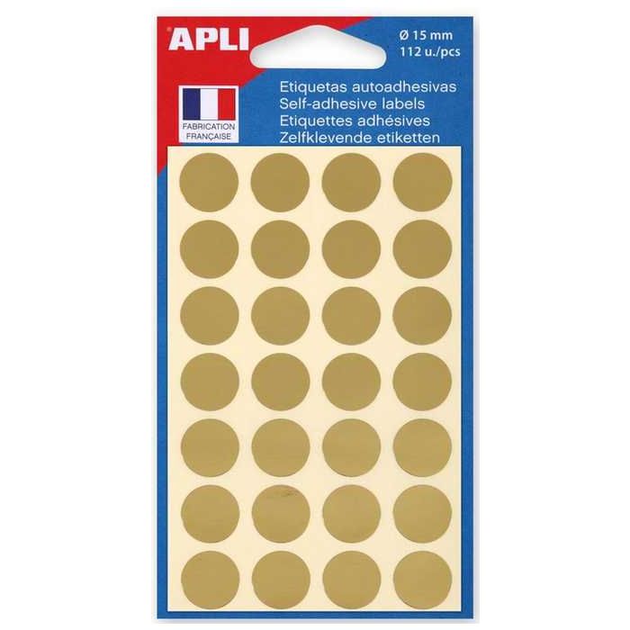 Paquet de 112 pastilles autocollantes 15 mm de couleur dorée d'APLI. Référence 100602