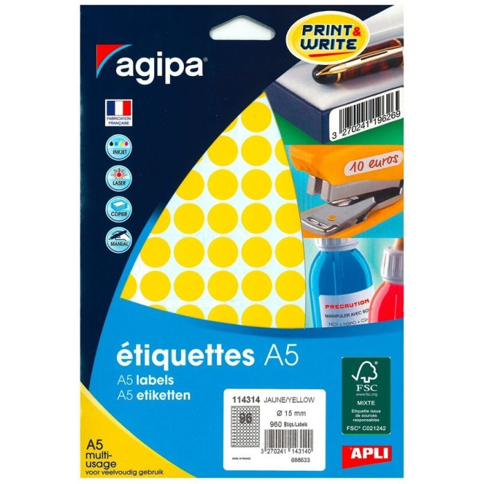 Gommettes autocollantes 15 mm de couleur Jaune AGIPA. Référence 114314