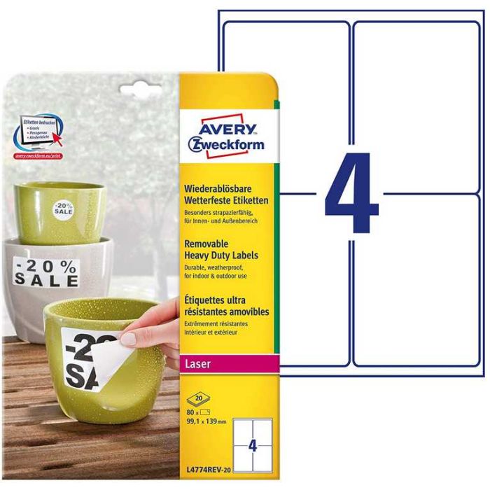 Étiquettes AVERY 99,1 x 139 mm, ultra résistantes et repositionnables pour marquer et étiqueter les produits et le matériel. Référence L4774REV-20