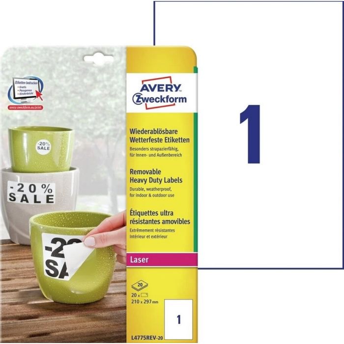 Étiquettes ultra résistantes repositionnables 210 x 297 mm d'AVERY. Référence L4775REV-20