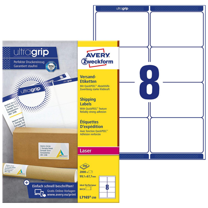 Étiquettes d'adresses autocollantes 99,1 x 67,7 mm à imprimer d'AVERY pour enveloppes et cartons. Référence L7165-250FR