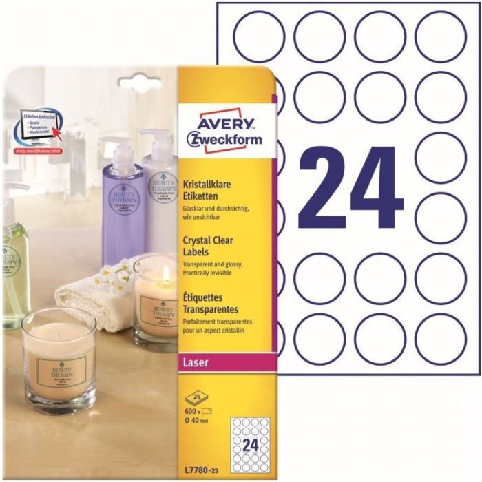 Étiquettes transparentes autocollantes très résistantes, diamètre 30 mm AVERY. Référence L7780-25
