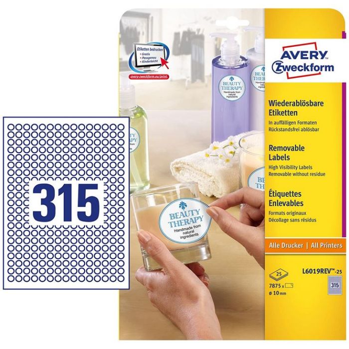 Petites Étiquettes autocollantes rondes 10 mm de couleur Blanche pour marquage, signalétique et étiquetage de marque AVERY. Référence L6019REV-25