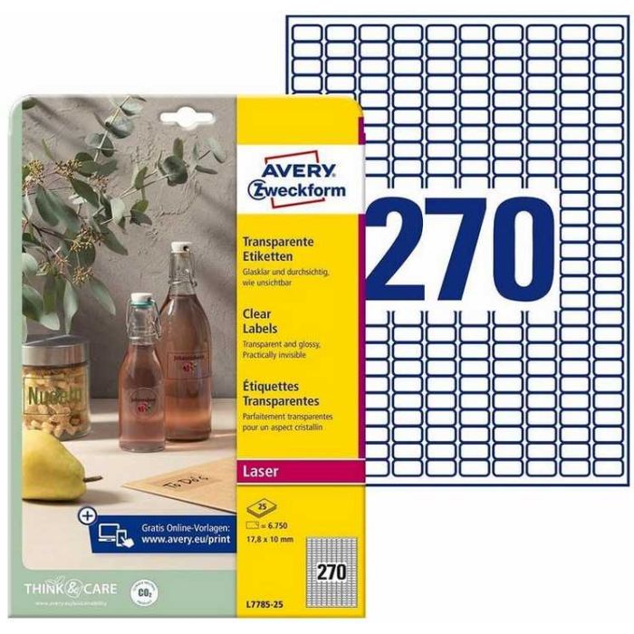 Mini Étiquettes transparentes autocollantes 17,8 x 10 mm d'Avery, très résistantes pour le marquage de produits ou documents. Référence L7785-25