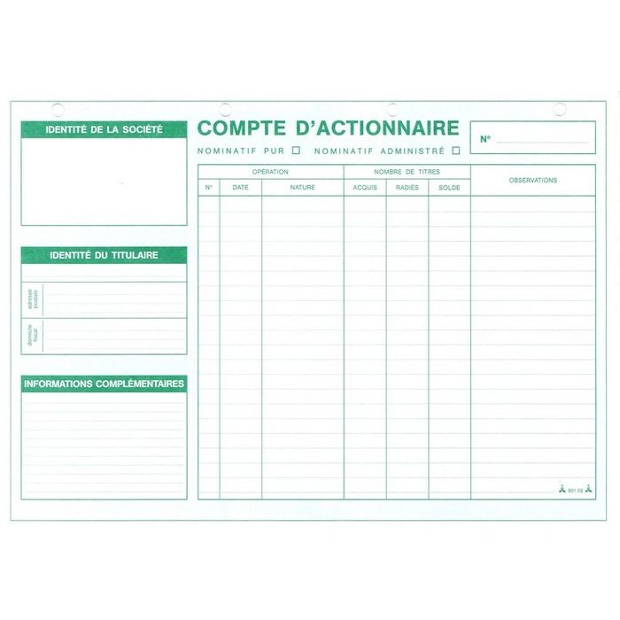 Fiches de comptes d'actionnaires sont perforées avec 4 trous pour faciliter le classement dans tout type de classeur.