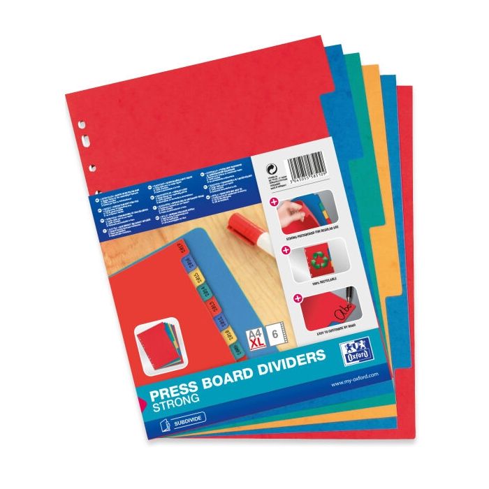 Assortiment de 6 intercalaires en carton 225 g/m2, format 245 x 297 mm d'OXFORD. Référence 100204990